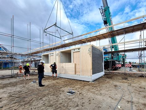 Op maandag 7 juli is de montage gestart van de eerste 12 van in totaal 21 houten modulaire Premodu woningen in Bergschenhoek voor het project Wilderszijde, de nieuwe woonwijk in Lansingerland.