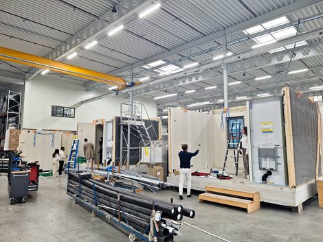 Daarna volgde het transport van de stekkerklare modules en elementen naar de bouwplaats. De montage verloopt snel, zoals te zien op de foto’s in de ochtend van de derde montagedag hieronder.